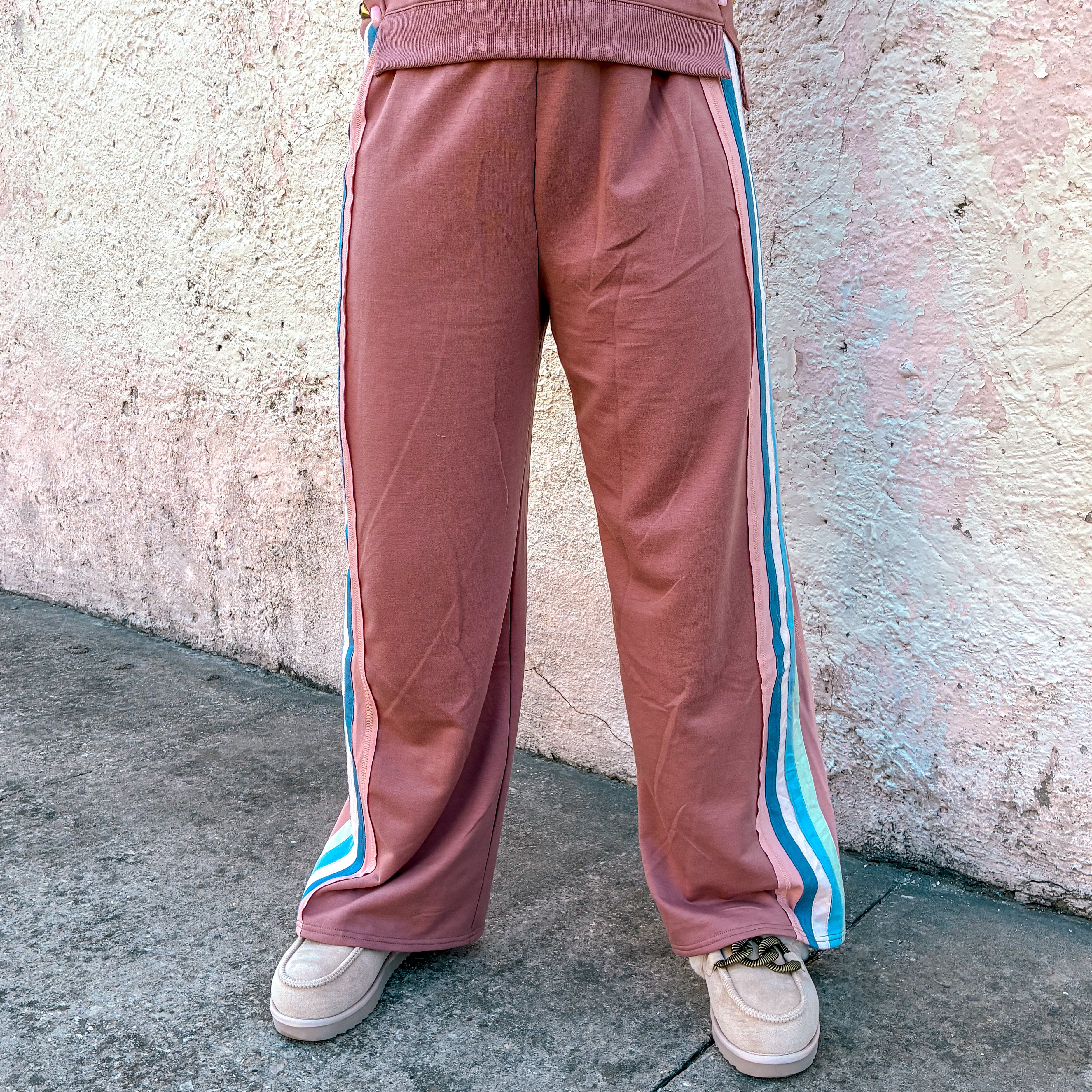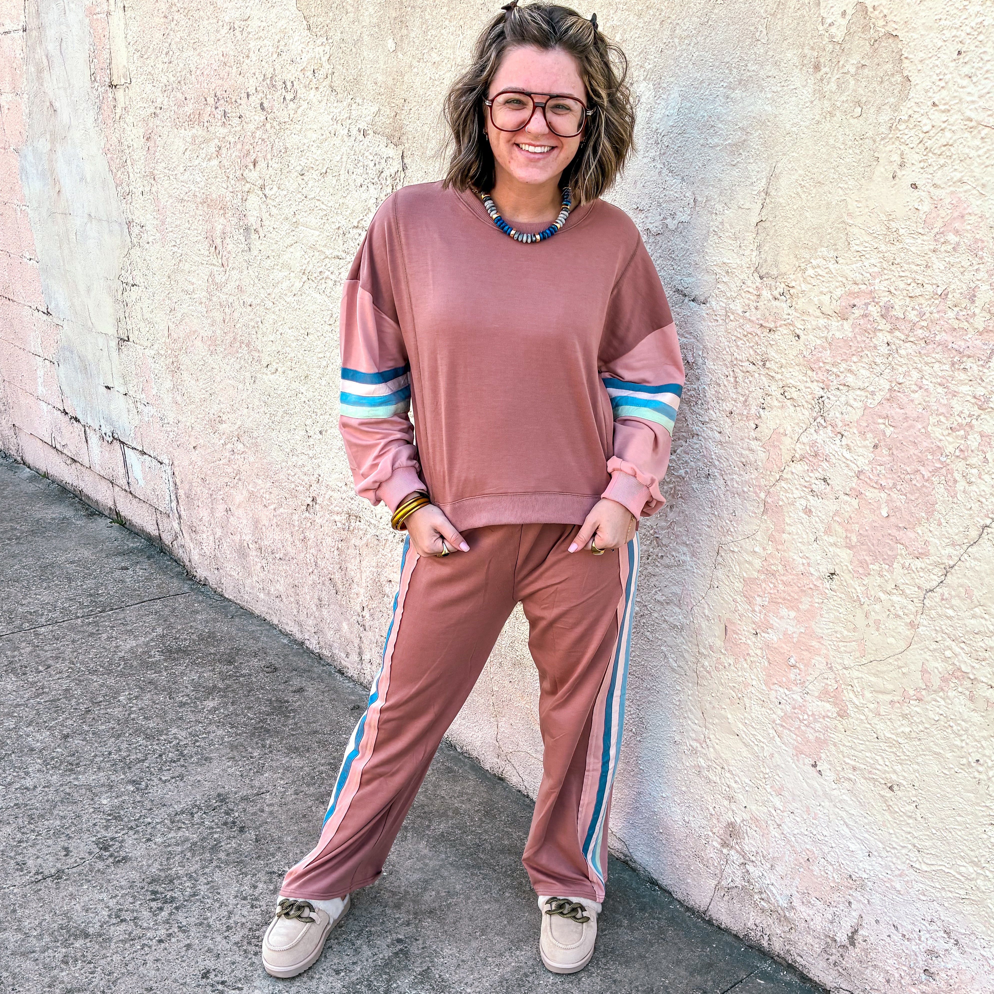 Experience effortless comfort and style with the Chill Mode Knit Set in Dark Mauve. The oversized top features drop shoulders, long sleeves, and a round neck, finished with a ribbed hem for a refined look. The matching wide-leg pants offer a relaxed fit with an elastic waistband and adjustable drawstring, ensuring customizable comfort. Perfect for lounging or casual outings, this color block knit set combines laid-back design with modern detailing for versatile everyday wear.