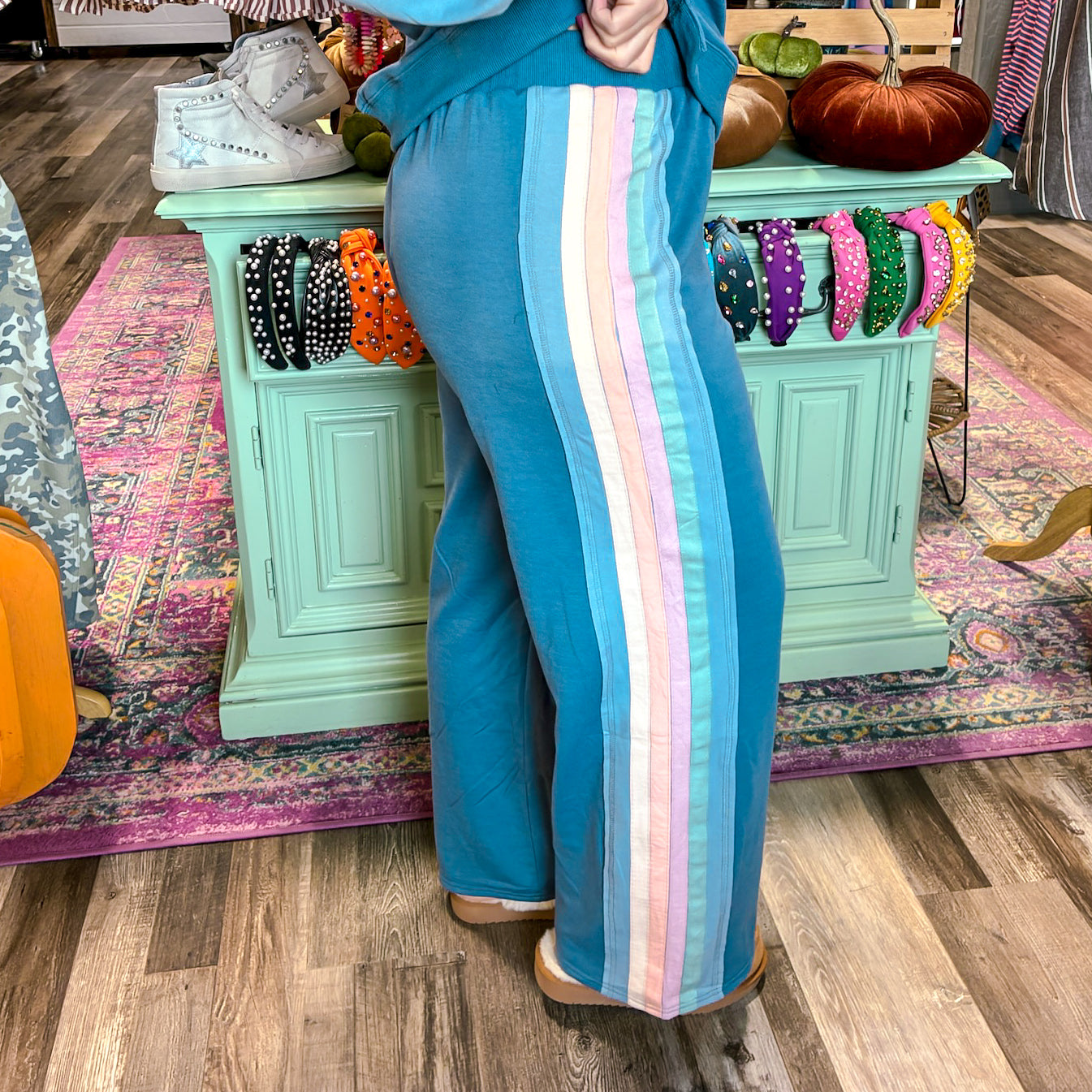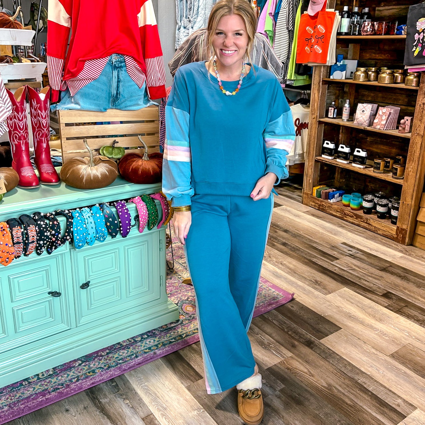 Experience effortless comfort and style with the Chill Mode Knit Set in Denim. The oversized top features drop shoulders, long sleeves, and a round neck, finished with a ribbed hem for a refined look. The matching wide-leg pants offer a relaxed fit with an elastic waistband and adjustable drawstring, ensuring customizable comfort. Perfect for lounging or casual outings, this color block knit set combines laid-back design with modern detailing for versatile everyday wear.
