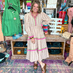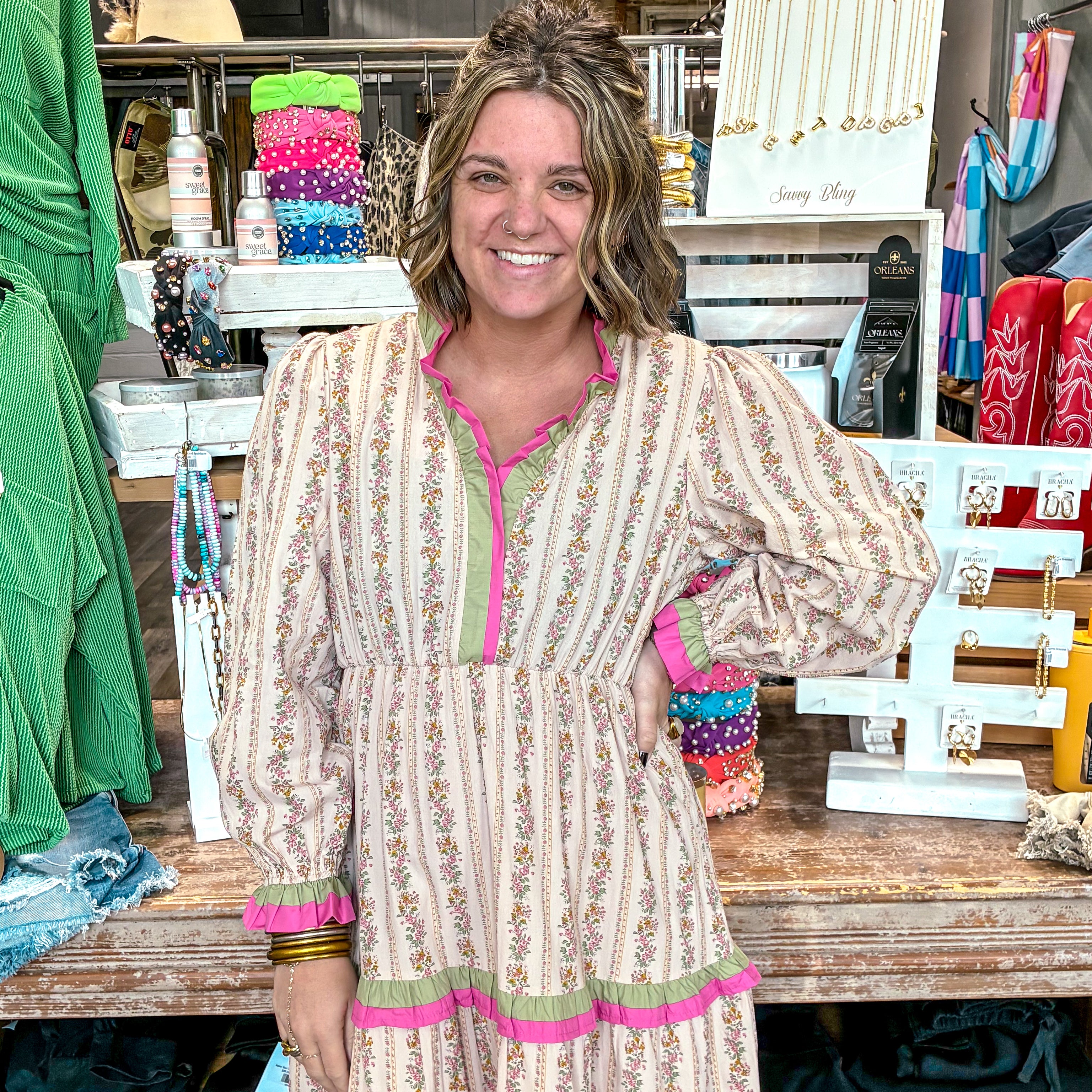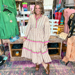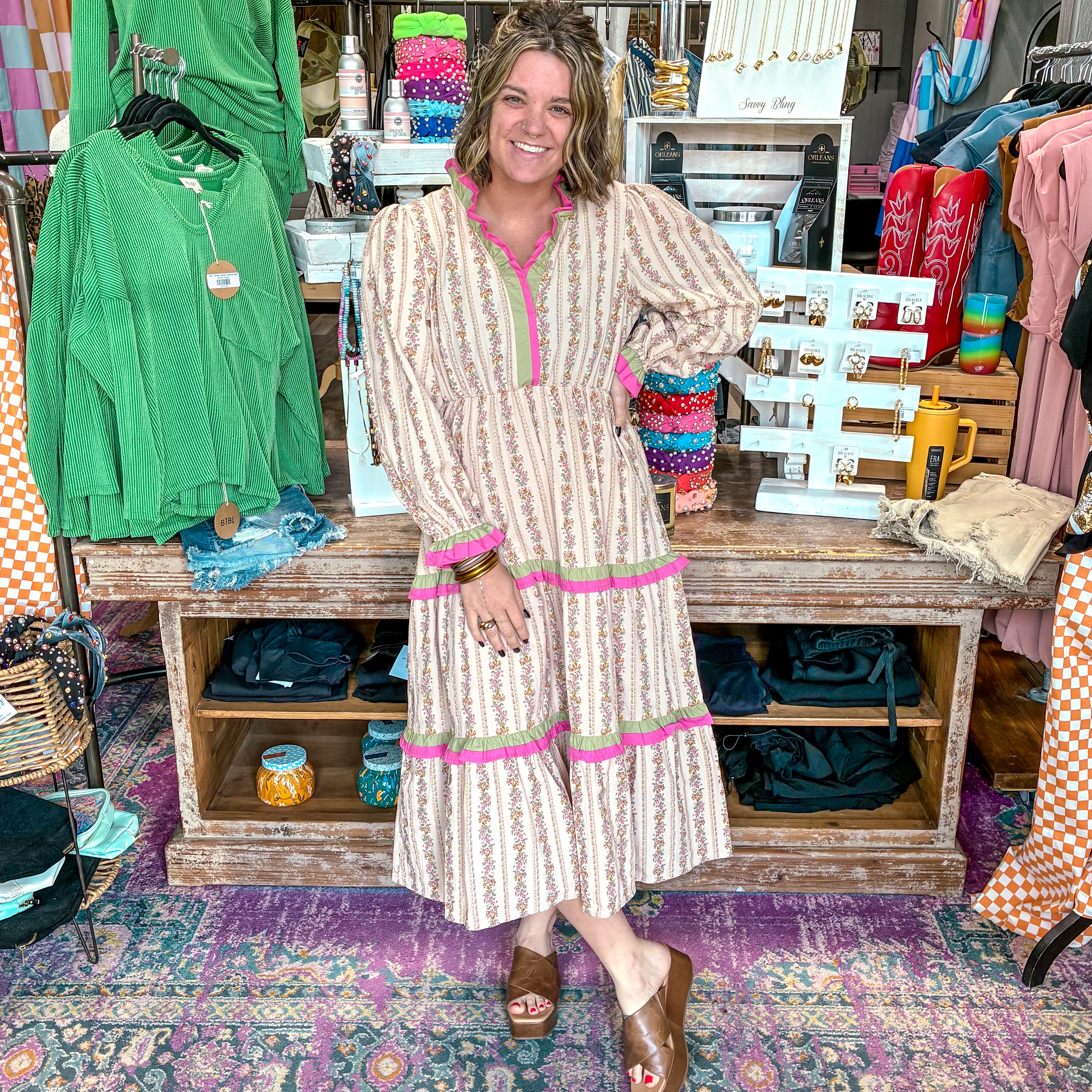 This Meadow Ruffle Midi Dress features a delicate floral stripe print that beautifully blends classic and contemporary styles. Designed with elegant ruffle edge details, it adds a subtle touch of femininity and movement. The midi length offers versatile wearability, perfect for both casual and dressier occasions, making it a refined addition to your wardrobe.