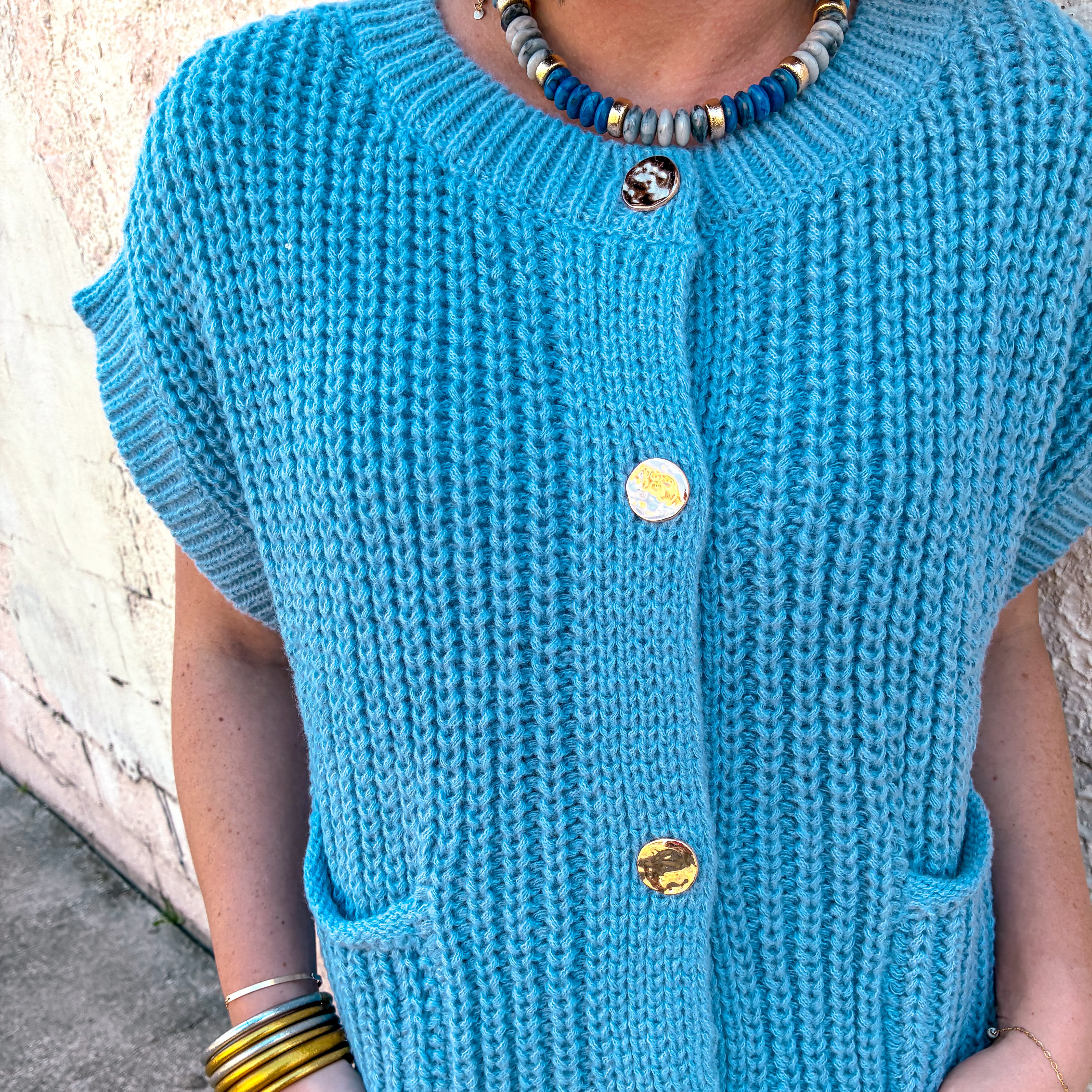 Experience effortless comfort with The Cozy Pocket Knit Top in Blue. This oversized button-down features a round neckline and short sleeves, ensuring a relaxed yet polished look. Practical front pockets add functionality while the ribbed hem provides a tailored finish. Perfect for layering or wearing alone, this knit top blends style and comfort for everyday wear.